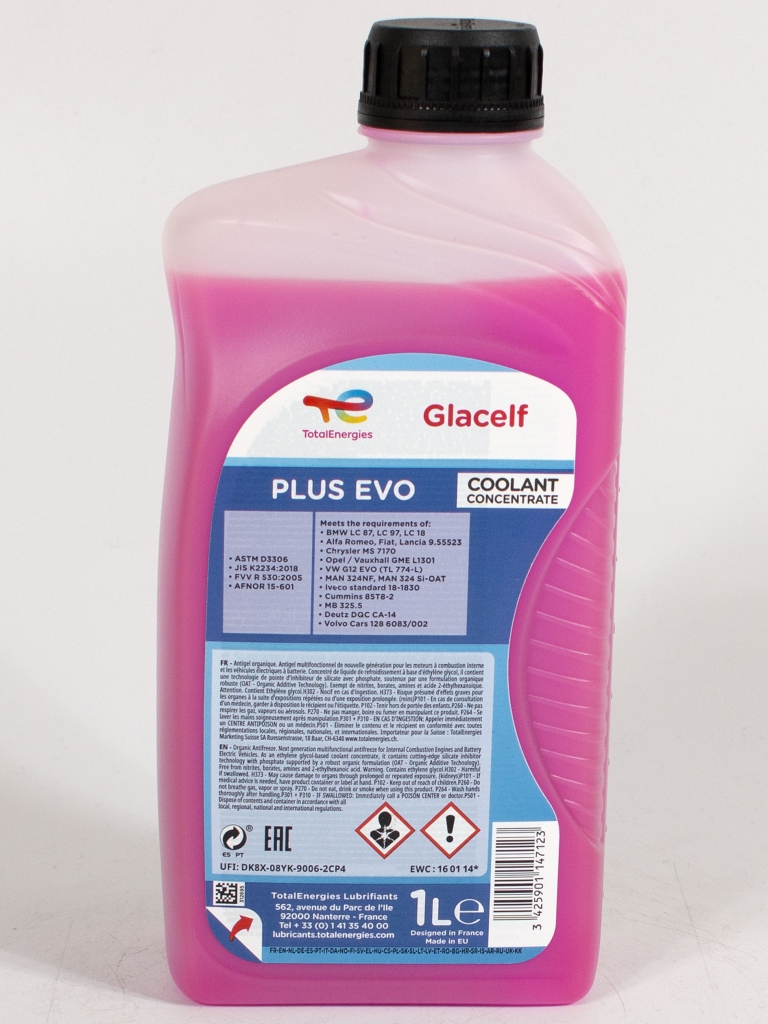 Glacelf Plus Evo — это антифриз премиум-класса нового поколения с «очень длительным сроком службы» на основе моноэтиленгликоля, содержащий передовую технологию силикатного ингибитора с фосфатом, поддерживаемым надежной органической основой (OAT — технология органических добавок).