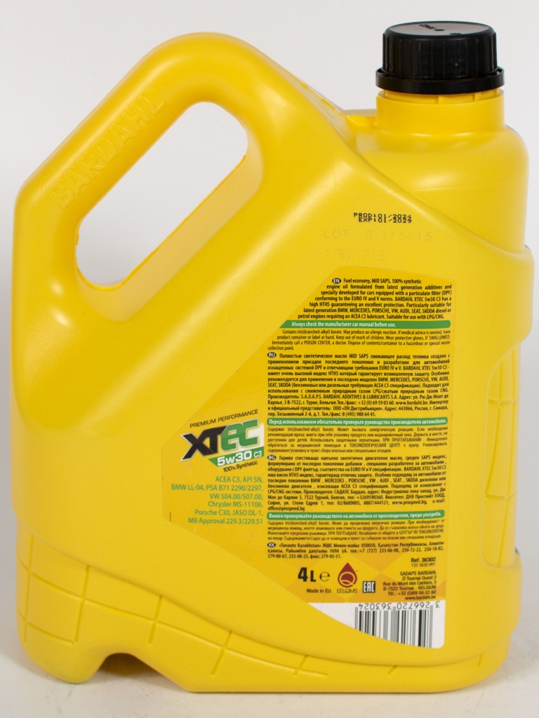 Энергосберегающее синтетическое моторное масло, специально разработанное для автомобилей, оснащенных фильтром твердых частиц (DPF) в соответствии с нормами EURO IV и EURO V. Bardahl XTEC 5W-30c3 обладает высоким HTHS (высокотемпературной вязкостью при высокой скорости сдвига), что гарантирует превосходную защиту двигателя. Предпочтительно для последних поколений BMW, MERCEDES, PORSCHE, VW, AUDI, SEAT, SKODA с бензиновыми или дизельными двигателями с допуском ACEA C3.