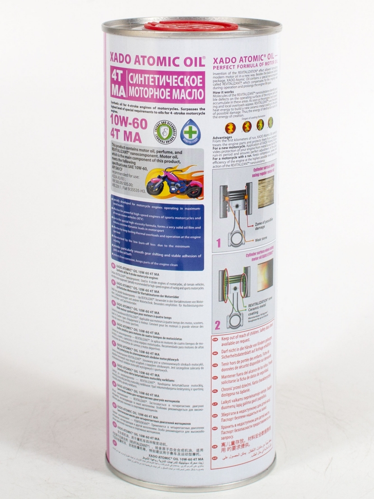 Xado Atomic Oil 10W-60 4T MA — высококачественное синтетическое моторное масло для 4-хтакных двигателей мототехники. Содержит атомарный ревитализант защищающий детали двигателя от износа.