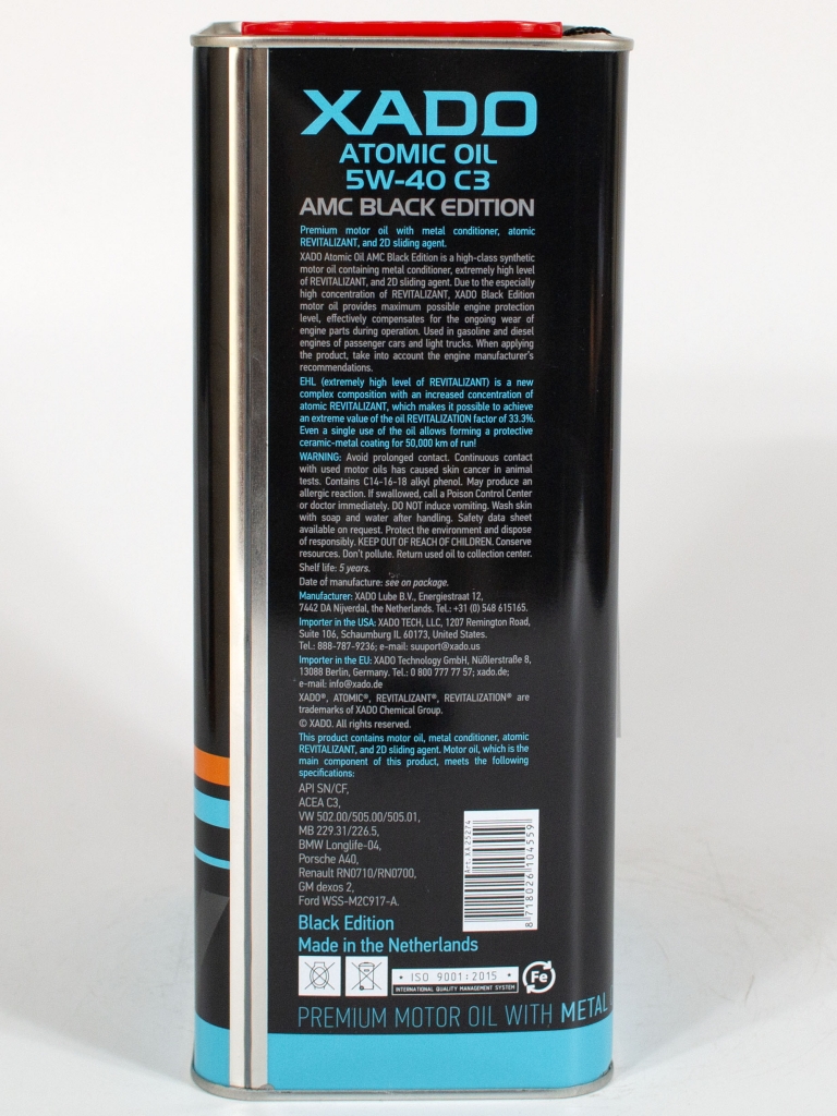 Премиальное ультрасовременное синтетическое масло с синергетической формулой AMC с расширенными эксплуатационными характеристиками XADO Atomic Oil 5W-40 С3 AMC Black Edition