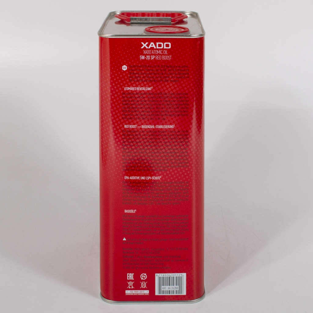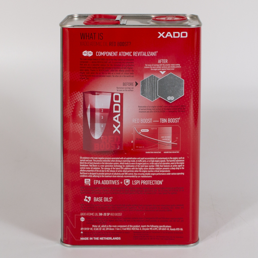XADO Atomic Oil 5W-20 SP RED BOOST - современное топливоэкономичное моторное масло специально разработано для бензиновых двигателей американских и японских легковых автомобилей, внедорожников, автофургонов, предусматривающих применение маловязких масел с более высокими эксплуатационными свойствами, отвечающих требованиям по эксплуатационным свойствам (API ЅР) и ресурсно- и энергосбережению (ILSAC GF-6). Соответствует самым строгим стандартам США 2010 года по защите двигателей от износа. Масло можно использовать в бензиновых двигателях, работающих на природном газе (LPG и CNG) и биотопливе, содержащем до 85% этанола (E85). Подходит для гибридных автомобилей Toyota, Honda и Lexus и может использоваться там, где предписаны GM dexos1, GM 6094M или Chrysler MS 6395.