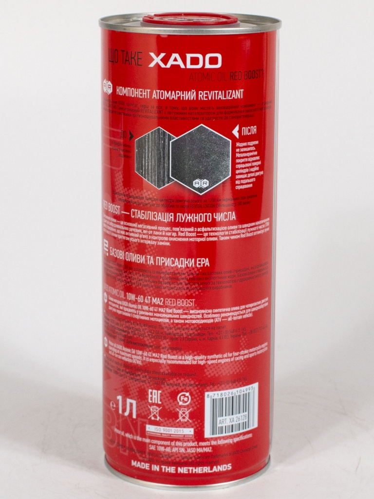 XADO Atomic Oil 10W-60 4T MA2 RED BOOST – вязкое масло для некоторых двигателей мотоциклов, которое эксплуатируется в режимах максимальных скоростей. Особенно рекомендуется для высокопроизводительных двигателей гоночных, спортивных мотоциклов и мотовездеходов (ATV - вездеход). Разработана на основе комплексного высокоэффективного базового масла, легированной специальным высокоэффективным пакетом присадок. Перейдите на уровень специальных средств к маслу для некоторых двигателей мотоциклов (JASO MA2).