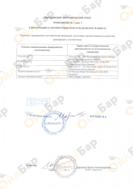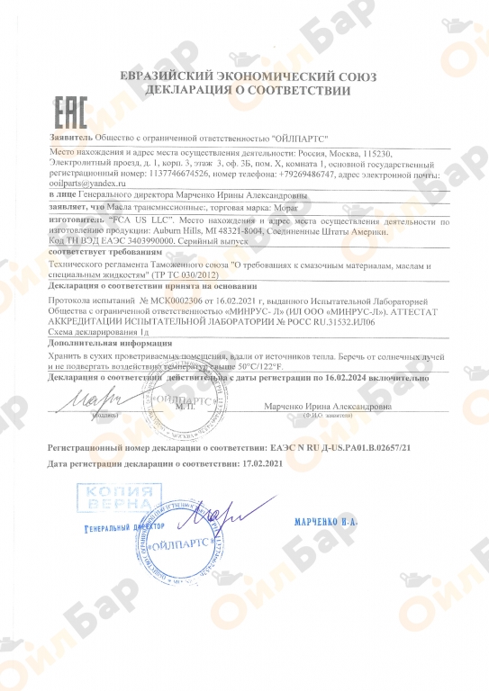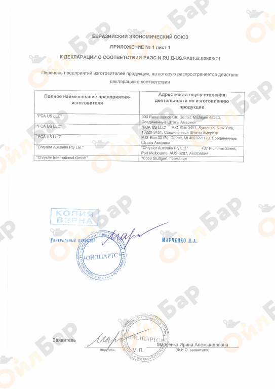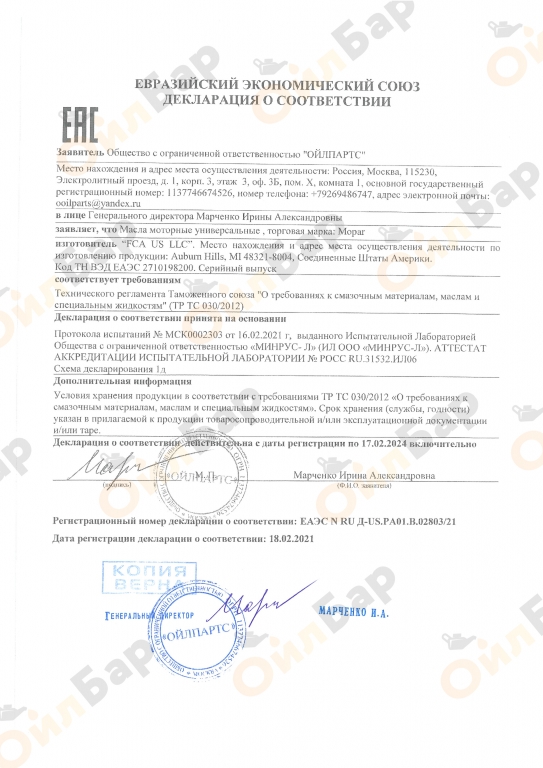 Предназначено для бензиновых двигателей автомобилей Chrysler, Jeep и Dodge. Соответствует стандартам API SP и ILSAC GF-6A. Обладает улучшенными характеристиками по сравнению с предыдущими категориями API SN и API SN PLUS. Обеспечивает надёжную работу двигателя, лёгкий запуск при низких температурах, защиту от износа и коррозии, а также идеальную чистоту двигателя.