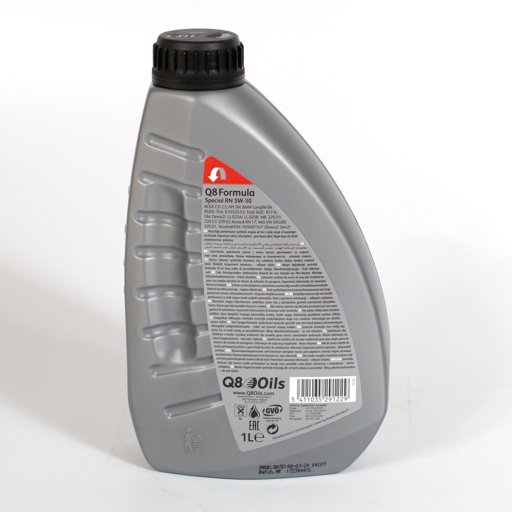 Масло Q8 Formula Special RN 5W-30 разработано специально для двигателей класса Евро 5 и 6, требующих соответствия спецификациям GM Dexos2, Vauxhall OV0401547, BMW LongLife-04 2019, Renault RN 17, VW и Mercedes-Benz.