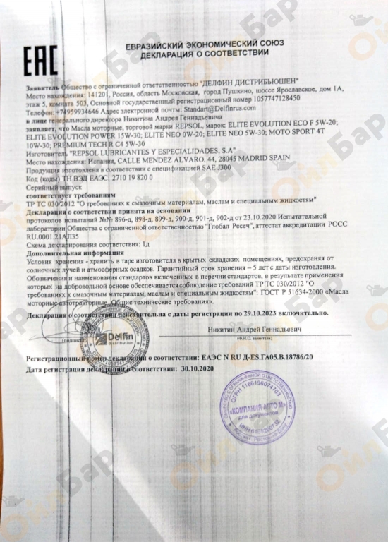 Моторное масло Repsol 5W-30 ELITE EVOLUTION LONG LIFE API SN/C3, 4л