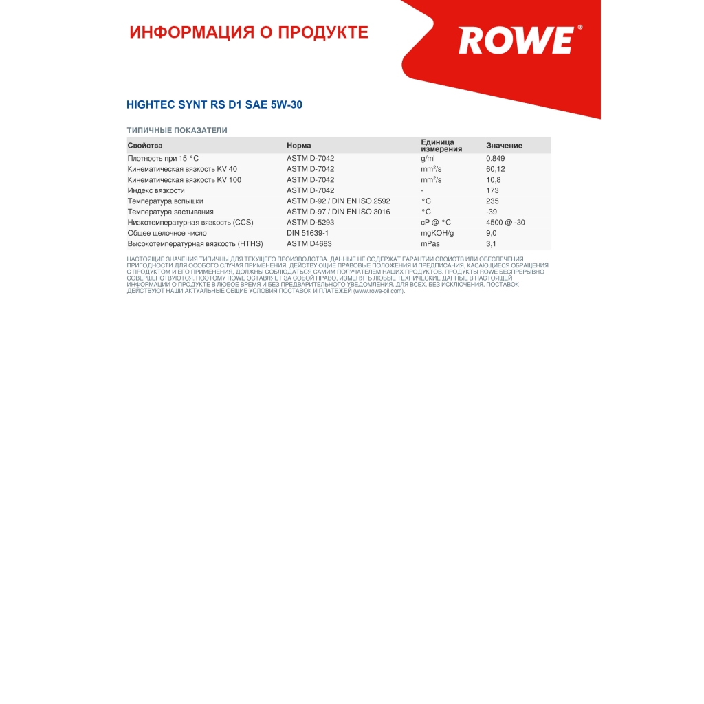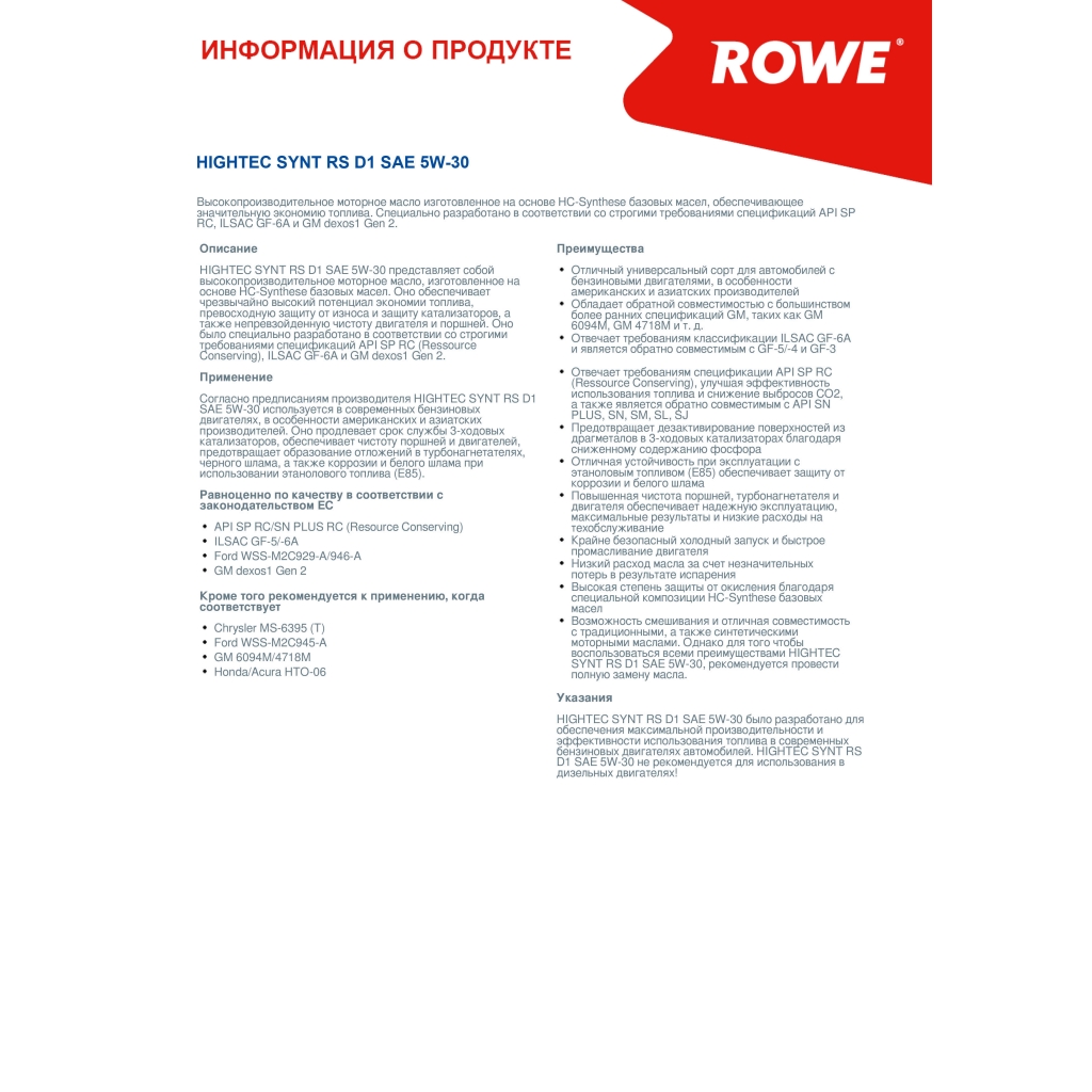 Главная / Моторные масла / Моторное масло ROWE HIGHTEC SYNT RS D1 SAE 5W-30, 1л