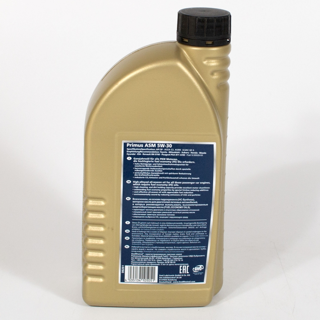 Swd Rheinol Primus ASM 5W-30 - высоколегированное, всесезонное, энергосберегающее моторное масло с хорошими антифрикционными свойствами для двигателей легковых автомобилей, где предписано или допускается масло Fuel Economy Oil (масло для экономии топлива). Низкая вязкость базовых масел специальной технологии синтеза, обеспечивает более быструю циркуляцию масла и низкий коэффициент трения, снижая, тем самым, расход топлива и выброс загрязняющих веществ в атмосферу. Также подходит для двигателей, оснащенных сажевым фильтром (DPF).