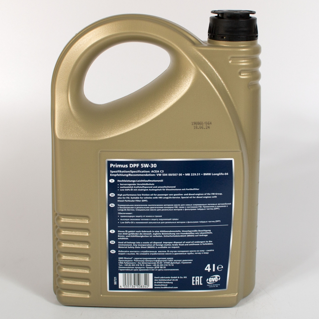 SwdRheinol Primus DPF 5W-30 - разработано для последнего поколения двигателей группы Фольксваген (VW). Рекомендуется для двигателей с удлинённым интервалом замены масла (WIV), а также без него. Может применяться в двигателях FSI (послойный впрыск топлива), а также в дизельных двигателях с сажевым фильтром (DPF) и без него. Продукт охватывает все предыдущие спецификации VW (исключения см. ниже).