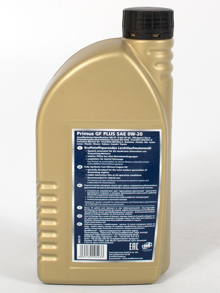 Swd Rheinol Primus GF5 0W-20 -высокоэффективное синтетическое моторное масло для самых современных бензиновых и дизельных двигателей, для смазки которых требуются энергосберегающие и низковязкостные моторные масла. Может быть использовано во всех двигателях, для которых предписан данный уровень вязкости, а также для турбированных многоклапанных двигателей с впрыском топлива легковых и небольших коммерческих автомобилей. Многие ведущие автопроизводители, такие как Хонда, Ниссан, Тойота, Форд, рекомендуют определённый уровень вязкости моторных масел для своих автомобилей.