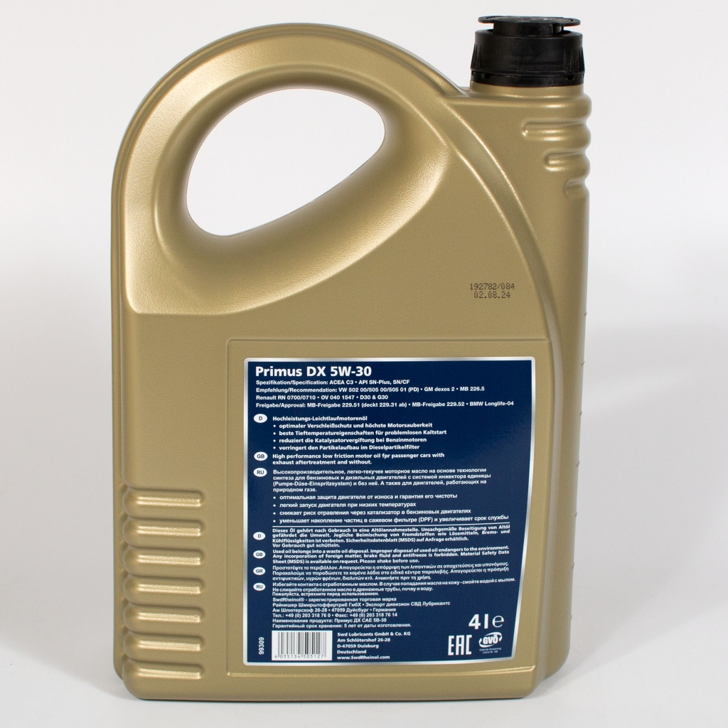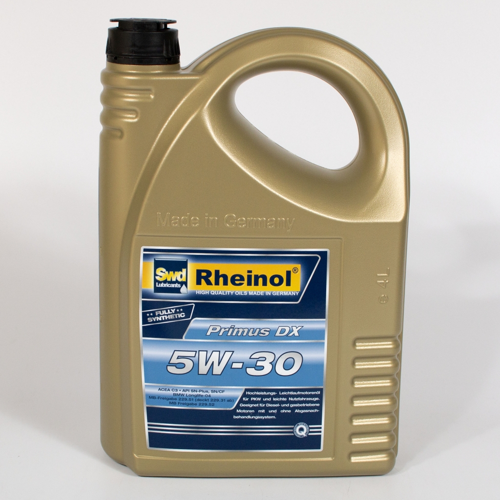 Swd Rheinol Primus DX 5W-30 - высокопроизводительное, легко-текучее моторное масло на основе технологии синтеза для бензиновых и дизельных двигателей с системой инжектора единицы (Pumpe-Düse-Einspritzsystem) и без неё, а также для двигателей, работающих на природном газе.