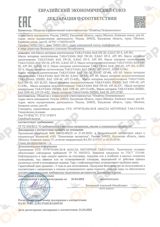 Полусинтетическое всесезонное моторное масло высшего класса TAKAYAMA SAE 10W-40 API SN/CF разработано для использования в бензиновых двигателях легковых автомобилей, в том числе турбированных с системами нейтрализации отработанных газов. Подходит для применения в дизельных двигателях легких грузовиков. Высококачественные базовые масла и многофункциональный пакет присадок обеспечивает быстрый и легкий запуск двигателя при низких температурах, превосходную защиту двигателя от износа, предотвращает образование отложений и увеличенный межсервисный интервал. Обеспечивает максимальный ресурс двигателя, защищая его от износа даже в тяжелых условиях эксплуатации.