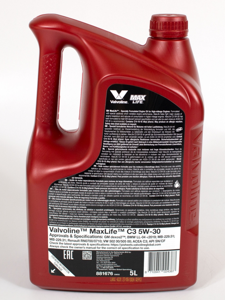 Моторное масло Valvoline MaxLife С3 5W-30, 5л