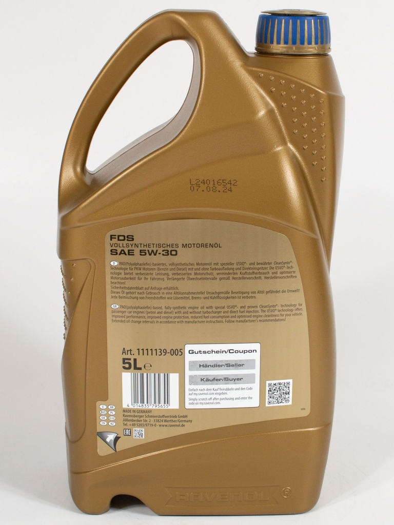 RAVENOL FDS SAE 5W-30 - полностью синтетическое легкотекучее моторное масло на основе ПАО, изготовленное с применением технологии CleanSynto® для легковых бензиновых и дизельных двигателей с и без турбонадува и прямым впрыском топлива.