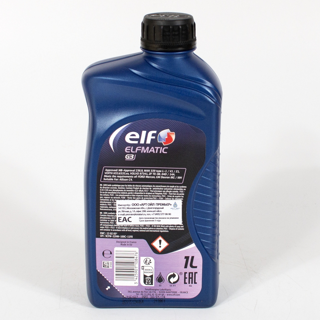 ELF Elfmatic G3 – жидкость для автоматических трансмиссий, предназначенная для автоматических и полуавтоматических коробок передач и гидротрансформаторов легковых автомобилей, самоходных рабочих машин.