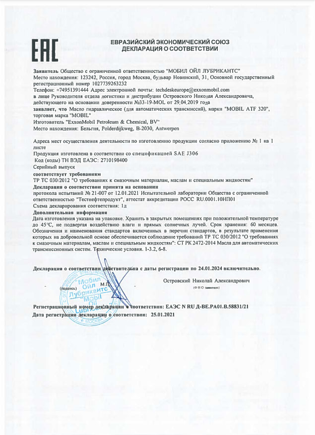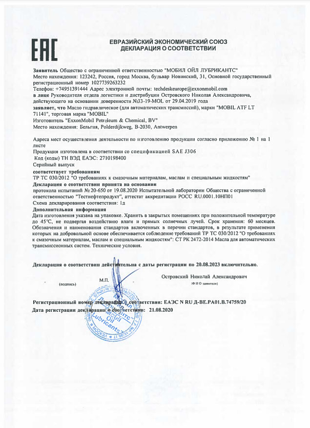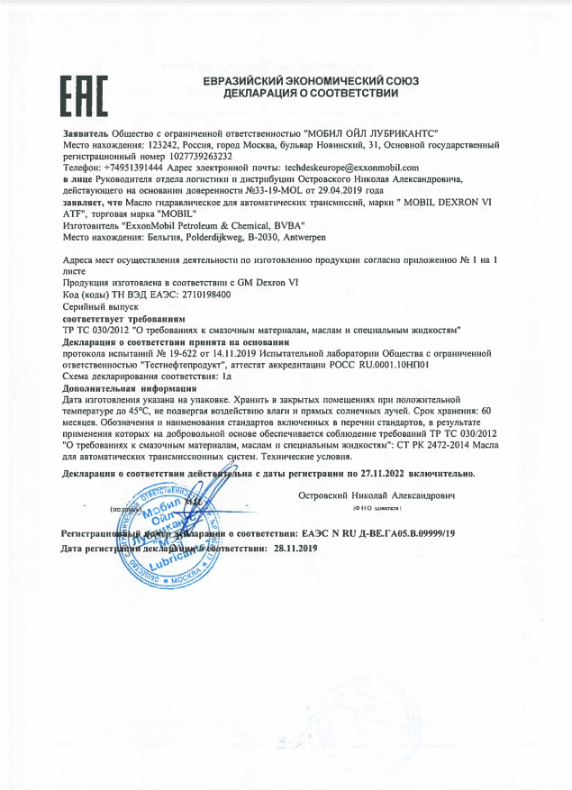Mobil ATF Multi-Vehicle обеспечивает сохранение гарантии автомобилей GM, где требуется жидкость DEXRON®-VI, поскольку она полностью соответствует строгим требованиям GM к жидкости DEXRON®-VI для современных трансмиссий, или превосходит их. Она также пригодна для применения в тех случаях, когда требуется уровень параметров DEXRON®-III или DEXRON®-II.