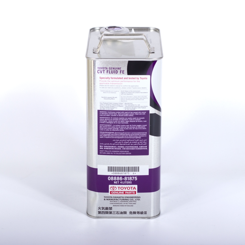 TOYOTA CVT FE — синтетическая трансмиссионная жидкость для вариаторных коробок переключения передач автомобилей Toyota, Lexus и Daihatsu. Продукт отличается пониженной вязкостью, за счет которой обеспечивает экономию топлива и комфортную эксплуатацию автомобиля при отрицательных температурах. Смазка не агрессивна по отношению к медно-содержащим деталям и не приводит к их коррозии. В отличие от масла Toyota CVT Fluid TC - является более современным и содержит пакет присадок, которые позволяют вариаторным трансмиссиям автомобилей Toyota наилучшим образом работать в условиях холодного климата. Рекомендуется для применения в вариаторных коробках передач, выпущенных после апреля 2012 года.
